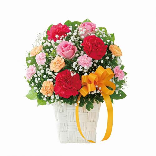 母の日にぴったりなカーネーションと「花の女王」とも呼ばれている王道のバラをあわせたアレンジメントです。まるでお母さんの笑顔のような可愛らしい色合いと、プレゼントには欠かせないオレンジのリボンがポイント。花キューピットで長年愛され続けている、上品でありながらもボリュームたっぷりなフラワーギフトです。