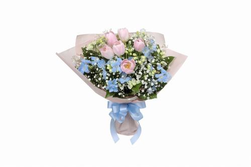 【ホワイトデー 限定フラワーギフト】ピンクと水色の組み合わせが爽やかな、ホワイトデー限定の花束です。ピンクのチューリップの花言葉は「誠実な愛」。お返しの気持ちをまっすぐに届けてくれるプレゼントです。ふんわりとしたフォルムが可愛らしいギフトで、ホワイトデーに想いを伝えましょう。