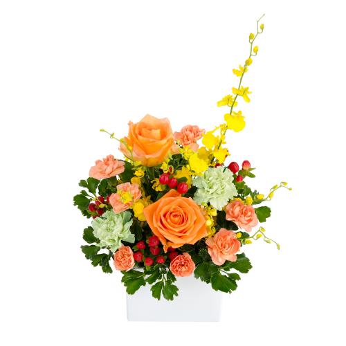 オレンジバラを中心にまとめた、ビタミンカラーのアレンジメント。ひらひらと舞う蝶のようなオンシジウムが華やかで、カジュアルにもフォーマルにも適したプレゼントです。