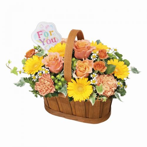 オレンジバラやイエローガーベラなど元気が出そうな明るい色の花々をウッドバスケットにたっぷり詰め込みました。かわいくなりすぎないデザインは女性だけでなく、男性にも喜んでいただけるギフトです。