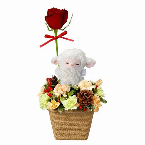 動物のマスコットが冬のお花畑でにっこり♪ 赤いバラを差し出すような姿が可愛らしいアレンジメントです。子供へのプレゼントにもおすすめ。マスコットは、パンダ・三毛猫・うさぎなどの豊富なラインナップから1つお付けいたします。どのマスコットが届くかはお楽しみ!