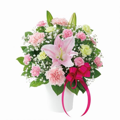 ピンクのユリとカーネーションで仕上げた、優しい色合いでありながら華やかな印象のアレンジメントです。ユリが美しく映えるシンプルなデザインは、花が好きなお母さんへの母の日のプレゼントにおすすめ。上品で落ち着いた花姿が、毎日忙しく頑張っているお母さんの心を和らげて、素敵な笑顔にしてくれます。