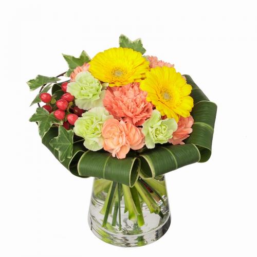 黄色のガーベラなどの、ビタミンカラーの花でまとめた花瓶付きの花束です。見ているだけで元気が出てくるような色合いの花束は、退職祝いやお見舞いなど、応援の気持ちを伝えるプレゼントにぴったり。届いたらそのまま置けるギフトなので、贈った相手の人が簡単に飾ることができます。