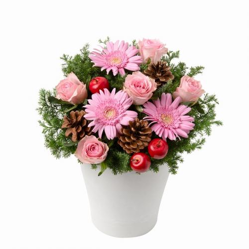 ピンクのバラとガーベラを使った、冬季限定のアレンジメント。冬にぴったりな花やグリーンで、季節を感じられるフラワーギフトに仕上げました。クリスマスはもちろん、冬のお祝いや記念日の贈り物におすすめです。
