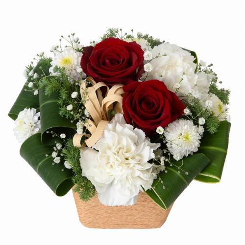 冬に似合う赤バラを中心に、白い花々とグリーンをあわせてナチュラルにまとめたアレンジメント。シンプルで落ち着いた雰囲気のフラワーギフトは、男性・女性を問わず幅広い年代の方に喜ばれるプレゼントです。