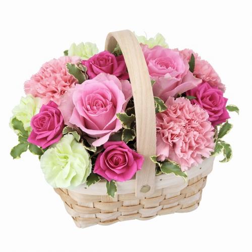 ウッドバスケットの中には、ピンク色を中心にかわいらしい花々を入れました。多くの花の中でも特に人気があるピンクバラの花言葉は「感謝・上品・温かい心」などがあり、プレゼントには最適です。オールラウンドで制作しているので、どこから見ても可愛いお花を楽しむことができます。