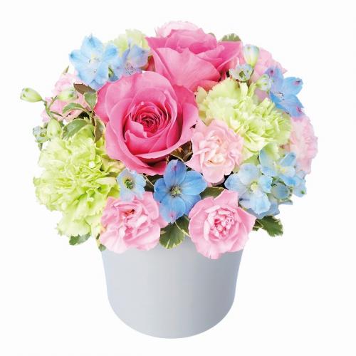 特に女性から人気のあるピンクバラなどの花々が可愛らしいアレンジメント。淡く優しい印象のパステルカラーが、お届け先を幸せな気持ちで包んでくれます。幅広い年代の方から喜んでもらえるフラワーギフトです。