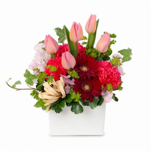 ピンクのチューリップが映える、まるで春の花畑のようなアレンジメント。赤とピンクのグラデーションが美しいフラワーギフトです。上品な色合いなので、目上の人へのプレゼントや、フォーマルなご用途にも最適です。