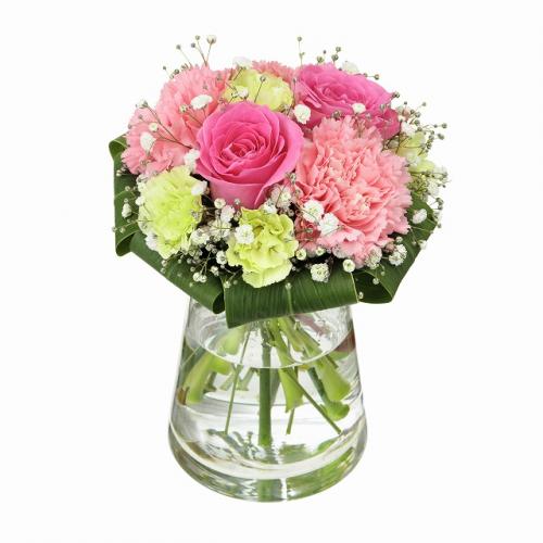 ピンク色のバラなどの可愛らしい花々を合わせました。上品なデザインは「ありがとう」や「おめでとう」の気持ちを伝えてくれること間違いなし。花瓶に入れてお届けするので、ご自宅に花瓶がない方にも安心して贈って頂けます。