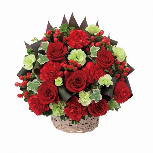 赤の花々をバスケットにたっぷりと生けたアレンジメントです。男性・女性を問わずに贈れるデザインとなっています。上品な赤バラの花言葉は「愛情」「情熱」「美」。赤い花は高級感があるので、いつもお世話になっている人や、目上の人へのプレゼントにもぴったりです。