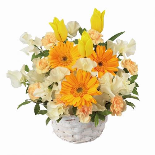 チューリップを中心に黄色系の花でまとめた春らしいアレンジメント。見ているだけで元気が出てくるようなビタミンカラーのギフトは、贈った相手の人を笑顔にしてくれるはず。誕生日や退職祝いのプレゼントにおすすめです。